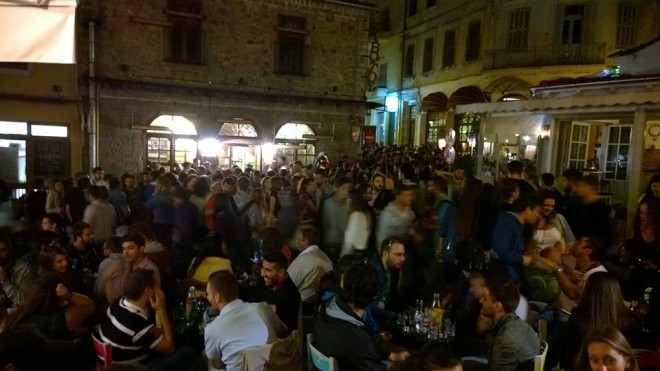 στην είσοδο της Παλιάς Πόλης, στην Πλατεία Αντίκα, κυρίως στη διασταύρωση των οδών Π. Χρηστίδη και Φ. Αμοιρίδη, όπου συγκεντρώνονται έξω από τα καταστήματα και συνεχίζουν την κουβέντα ή τη διασκέδαση.