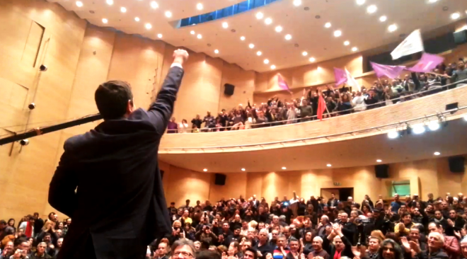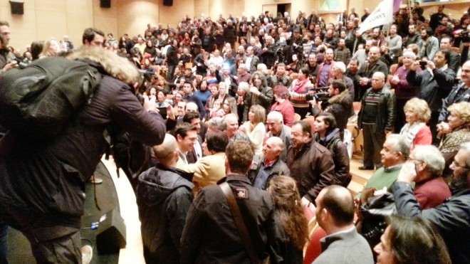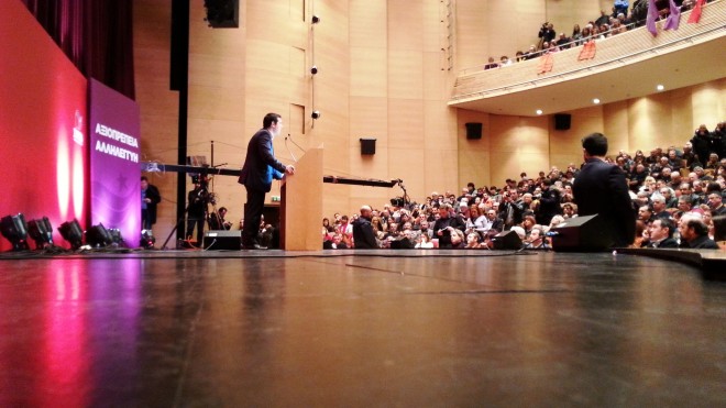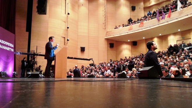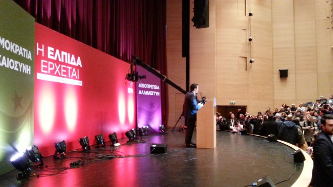 Στην ομιλία του ο Αλέξης Τσίπρας ανέφερε ότι αυτό που συμβαίνει στην Ελλάδα είναι πρωτόγνωρο και ότι η Ευρώπη στρέφει το βλέμμα της στην Ελλάδα για τη μεγάλλη αλλαγή που συντελείται ενώ δεν παρέλειψε να αναφέρει ότι μετά την Ελλάδα ακολουθεί η Ισπανία, όπου φέτος θα ανέβει στην εξουσία το Podemos, το κίνημα που ξεκίνησε από την ίδια λανθασμένη πολιτική της λιτότητας που εξαθλιώνει τους πολίτες.