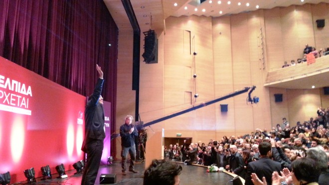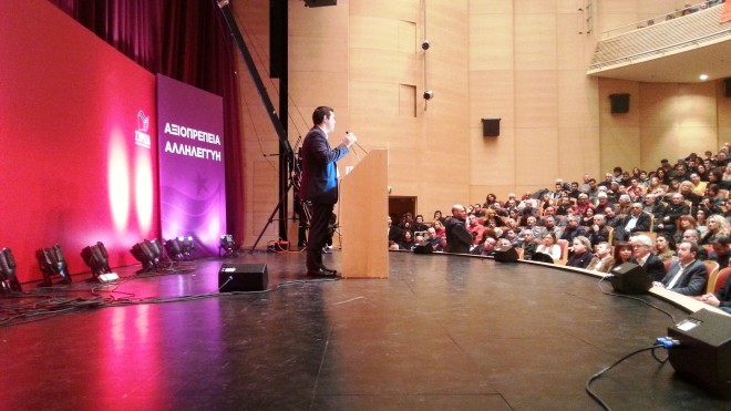 Μετέφερε τη συνομιλία του με μια ηλικιωμένη γυναίκα στην Καβάλα που του μετέφερε ότι οι άνθρωποι έχουν χάσει την αξιοπρέπειά τους λέγοντας ότι ο ΣΥΡΙΖΑ θα υλοποιήσει το πρόγραμμά του και θα αλλάξει την ψυχολογία του κόσμου. Μάλιστα σε αρκετές περιπτώσεις τόνισε ότι το κόμμα του θα εφαρμόσει άμεσα το πρόγραμμα της Θεσσαλονίκης. Όπως είπε “Οι εκλογές είνα η ιδρυτική διακήρυξη μιας πλατιάς κοινωνικής συμμαχίας για την κυβέρνηση που θα εφαρμόστει το πρόγραμμα του ΣΥΡΙΖΑ , που αποτελεί τις προγραμματικές δηλώσεις της νέας κυβέρνησης.
