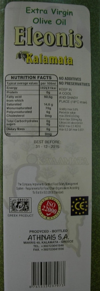 Πρόκειται για το προϊόν με την εμπορική επωνυμία «ΕΛΑΙΩΝΙΣ», σε συσκευασία των 5 L και ημερομηνία λήξης 31-12-2015, το οποίο φέρει τις ενδείξεις «PRODYCED – BOTTLED ATHINAIS SA, MAKRIS 40, KALAMATA» και διατίθεται στην αγορά από την εταιρία «ΠΑΥΛΟΣ ΙΝΤΑΣ», Μπουμπουλίνας 76, Σταυρούπολη Θεσσαλονίκης.