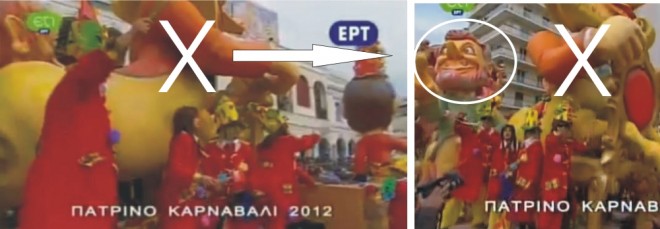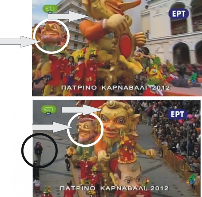 Όμως μερικές ακόμη φωτογραφίες που αναρτά το XanthiPress.gr , δείχνουν οι πατρινοί καρναβαλιστές τους οποίους ο Πρόεδρος της Στέγης σύγκρινε με το μέγεθος του έργου, βρίσκονται δίπλα στη μπροστινή μεγάλη μορφή που υπήρχε και όχι στις επίμαχες δύο μορφές που βρέθηκαν στην Ξάνθη . Αυτές βρίσκονται στο πίσω μέρος του άρματος και το μέγεθός τους είναι αντίστοιχο όπως φαίνεται από τη σύγκριση με τον οπερατέρ που βρίσκεται στο ίδιο επίπεδο αλλά κυρίως τους καρναβαλιστές, αφού ο κοντινότερος φτάνει στον ώμο του “καρεκλοκένταυρου”, όπως ακριβώς και στη φώτο που ανάρτησε ο Μ. Φανουράκης. Μάλιστα από τη φώτο που αναρτήθηκε φαίνεται επίσης ότι οι κορώνες -που δεν υπήρχαν στην Πάτρα- έχουν προστεθεί εκ των υστέρων.
