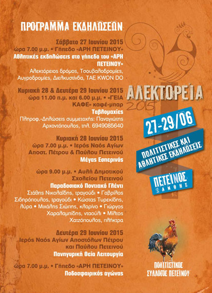 Οι καθιερωμένες εδώ και δεκαετίες εκδηλώσεις “Αλεκτόρεια” στον Πετεινό Ξάνθης, διοργανώνονται φέτος το τριήμερο 27-29 Ιουνίου 2015, παράλληλα με την πανήγυρι […]