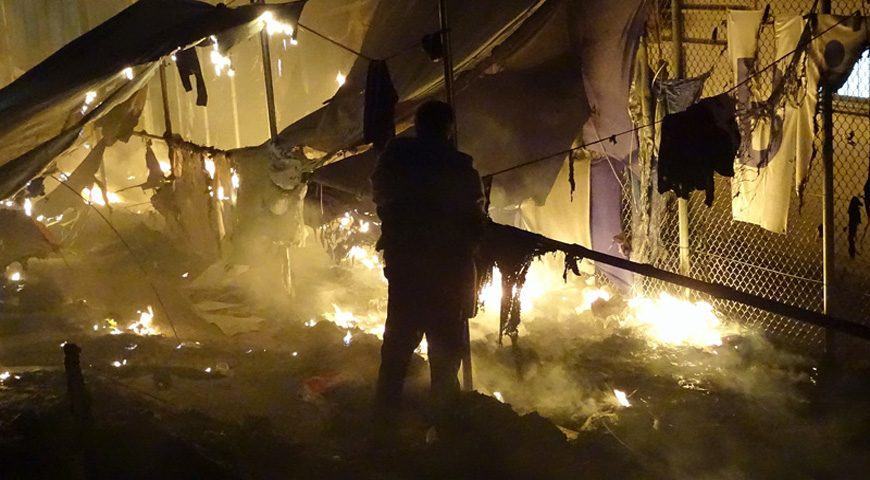 Εκεί όπου δύο άνθρωποι, μια 60χρονη γυναίκα και το πεντάχρονο εγγόνι της, Κούρδοι πρόσφυγες από το Ιράκ, εγκλωβισμένοι στη Λέσβο εδώ και τέσσερις μήνες, είναι τα θύματα της μεγάλης φωτιάς που κατέκαψε τα μεσάνυχτα μεγάλο μέρος του hot spot της Μόριας.
