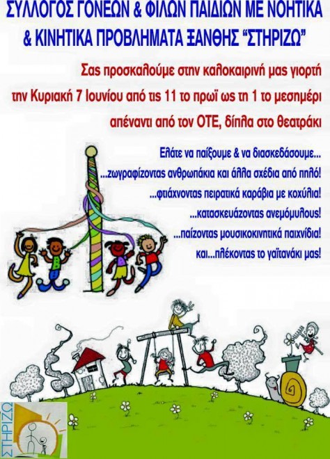 Η καλοκαιρινή γιορτή του Συλλόγου Γονέων και Φίλων Παιδιών με νοητικά και κινητικά προβλήματα Ξάνθης «Στηρίζω» πρόκειται να πραγματοποιηθεί την Κυριακή στο Θεατράκι της Πλατείας, απέναντι από τον ΟΤΕ.