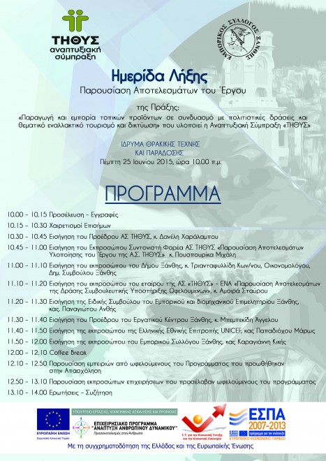 Η Α.Σ. ΤΗΘΥΣ και ο ΕΜΠΟΡΙΚΟΣ ΣΥΛΛΟΓΟΣ ΞΑΝΘΗΣ διοργανώνουν ΗΜΕΡΙΔΑ ΛΗΞΗΣ του προγράμματος που υλοποιεί η Αναπτυξιακή Σύμπραξη στα πλαίσια της Πράξης: «Παραγωγή και εμπορία τοπικών προϊόντων σε συνδυασμό με πολιτιστικές δράσεις και θεματικό εναλλακτικό τουρισμό και δικτύωση» του προγράμματος ΤΟΠΕΚΟ.