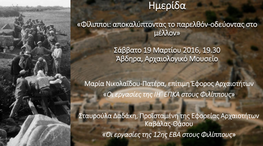 Η εκδήλωση γίνεται το Σάββατο, 19 Μαρτίου 2016, στις 7.30 μ.μ. στην Αίθουσα Πολλαπλών Χρήσεων του Αρχαιολογικού Μουσείου Αβδήρων  με τις ομιλίες της  Μαρίας Νικολαΐδου – Πατέρα με θέμα «Οι εργασίες της ΙΗ΄ ΕΠΚΑ στους Φιλίππους» και της Σταυρούλας Δαδάκη με θέμα «Οι εργασίες της 12ης ΕΒΑ στους Φιλίππους»