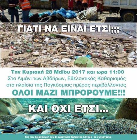 Στα πλαίσια της Παγκόσμιας Ημέρας Περιβάλλοντος ο Κυνηγετικός Σύλλογος Ξάνθης καλεί τα μέλη του να παρευρεθούν, στον εθελοντικό καθαρισμό που θα πραγματοποιηθεί στο λιμάνι των Αβδήρων και διοργανώνεται από το Λιμεναρχείο του Πόρτο Λάγος, με την συμμετοχή εθελοντικών ομάδων, την Κυριακή 28 Μαϊου στις 11:00 το πρωί.