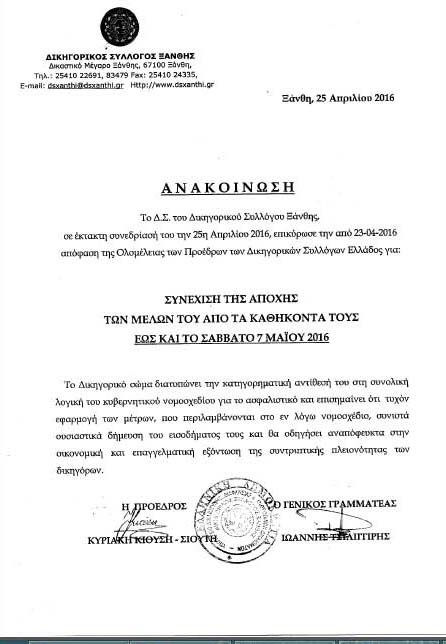 Με έκτακτη συνέλευση ο Δικηγορικός Σύλλογος Ξάνθης επικύρωσε την απόφαση της Ολομέλειας των προέδρων Δικηγορικών Συλλόγων της Ελλάδος για συνέχισης της απεργίας-αποχής.