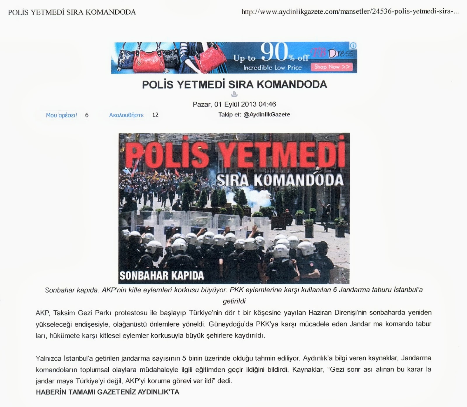 Την εντυπωσιακή αποκάλυψη ότι ο Τούρκος πρωθυπουργός Ταΐπ Ερντογάν, διακατεχόμενος από έντονο φόβο επικείμενων μεγάλων ταραχών και επιχειρήσεων αποσταθεροποίησης της Τουρκίας ετοιμάζει ειδικά σώματα κομάντος για να κατέβουν στους δρόμους των τουρκικών πόλεων προς αντιμετώπιση αντικυβερνητικών διαδηλώσεων, κάνει η γνωστή τουρκική εφημερίδα, Aydınlık.