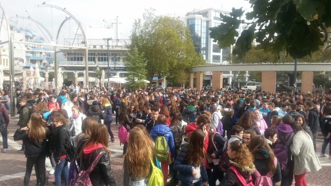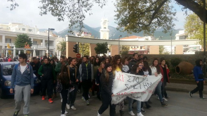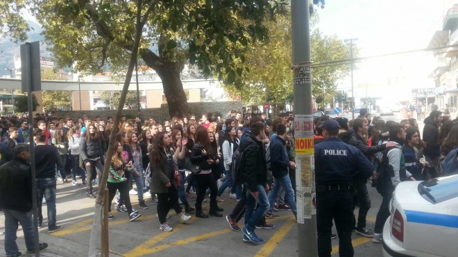 image-243dd40722875822a859ddf04592e523c6f9659bf5f0a526bc64bc9b0215c547-VΑπό το πρωί της Δευτέρας τελούσαν υπό κατάληψη τα περισσότερα Λύκεια της Πόλης, αρκετά Γυμνάσια καθώς και το Μουσικό Σχολείο. Στην πορεία που ξεκίνησε από την Κεντρική Πλατεία και κατευθύνθηκε στους κεντρικούς δρόμους συμμετείχαν πάνω 600-700 μαθητές όλων των σχολείων.