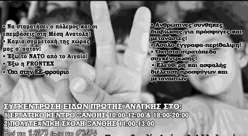 Η Πρωτοβουλία Αγώνα και Αλληλεγγύης στους Πρόσφυγες και Μετανάστες, προχωρά στη συγκέντρωση ειδών άμεσης ανάγκης, σαν έκφραση στοιχειώδους ανθρώπινης αλληλεγγύης προς τους σύγχρονους κολασμένους της γης, αλλά και γιατί τους νοιώθει σαν τους φυσικούς συμμάχους στον αγώνα ενάντια στον πόλεμο, για ειρήνη και ανθρώπινες, αξιοπρεπείς συνθήκες ζωής.